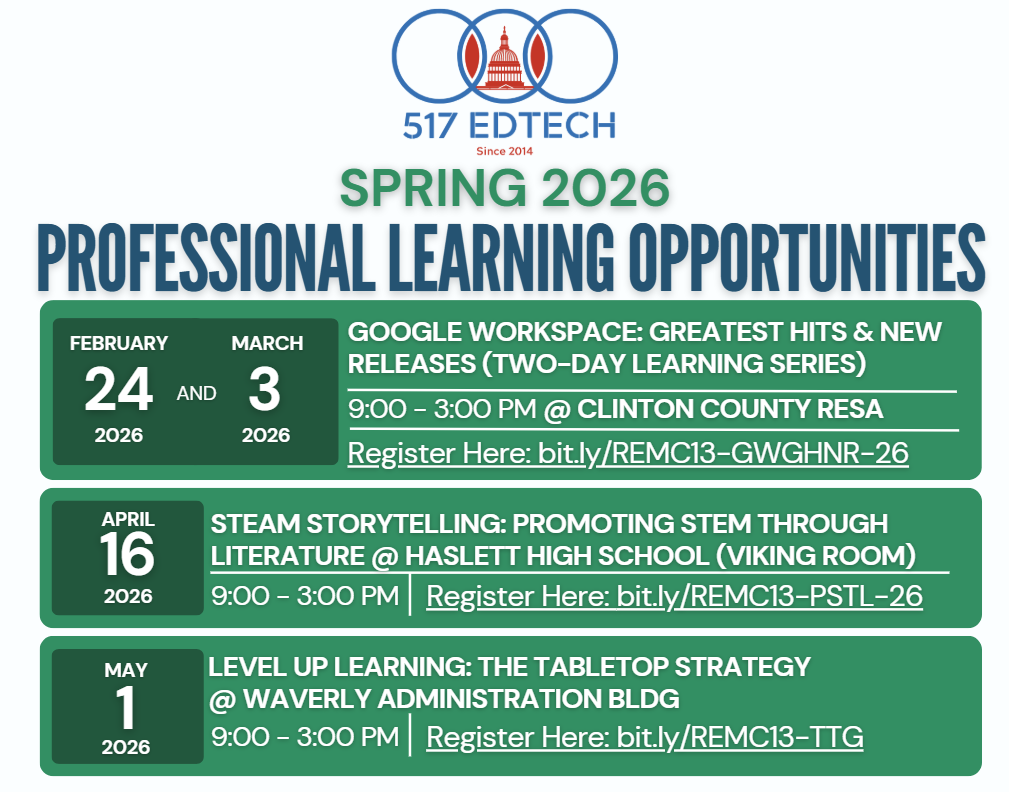 Two-Day 517 Ed Tech Google Workspace exploration returns this spring. This time at Clinton County RESA!